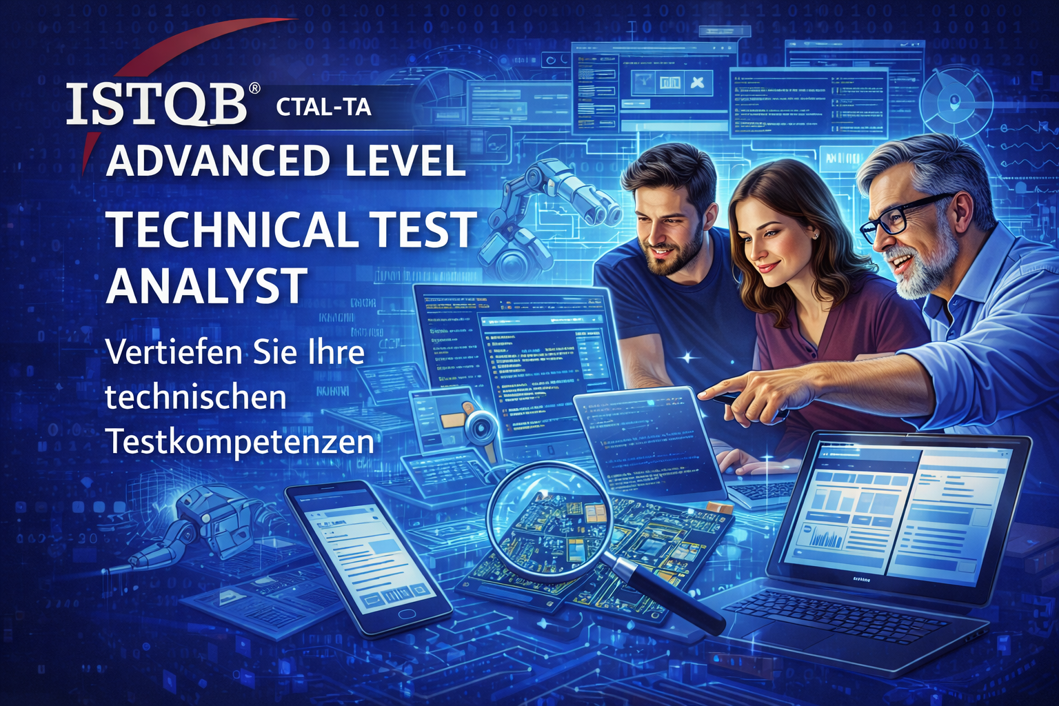 Der ISTQB® Certified Tester Advanced Level – Technical Test Analyst richtet sich an erfahrene Softwaretesterinnen und -tester, die ihre technischen Fähigkeiten im Softwaretest gezielt ausbauen möchten. Die international anerkannte Zertifizierung vermittelt vertiefte Kenntnisse in den Bereichen technischer Testverfahren, Testautomatisierung sowie nicht-funktionaler Tests.